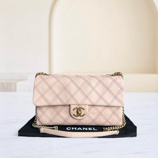 Sac Chanel Chic Flap Seasonal Flap Medium - 25 cm, en agneau matelassé rose avec finitions dorées. Series 21