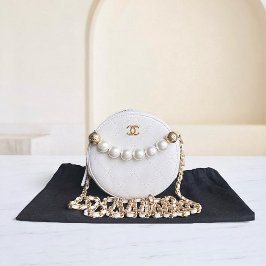 Pochette ronde Chanel Pearl avec chaîne, cuir de veau blanc, finitions en métal doré vieilli, taille 29