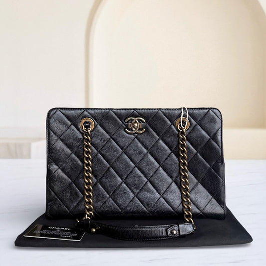 Sac cabas Chanel - Cuir de veau matelassé noir et finitions dorées