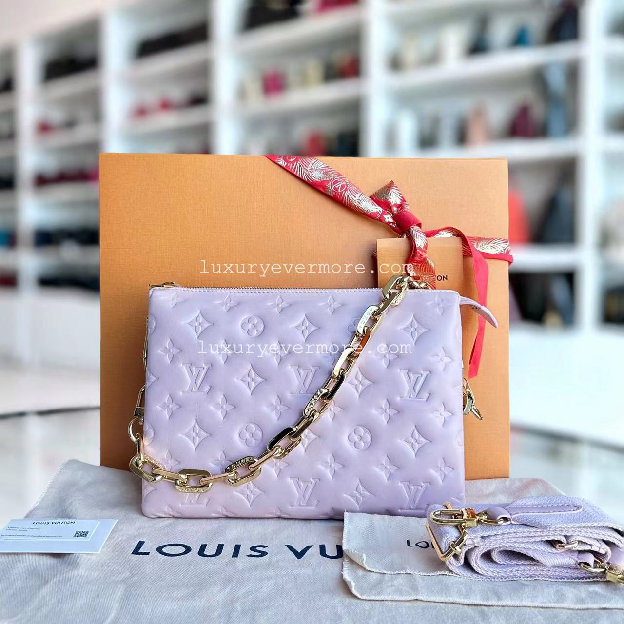 Luxueux et rêveur, ce sac Coussin PM de Louis Vuitton en cuir d'agneau bouffant violet clair est une véritable pièce de déclaration. La quincaillerie dorée ajoute une touche d'élégance, ce qui en fait un accessoire remarquable pour toute collection. Rarement vu dans ce coloris, c'est un incontournable pour les collectionneurs en quête d'un objet unique. Parfaitement polyvalent, ce sac passe sans effort du jour à la nuit.
